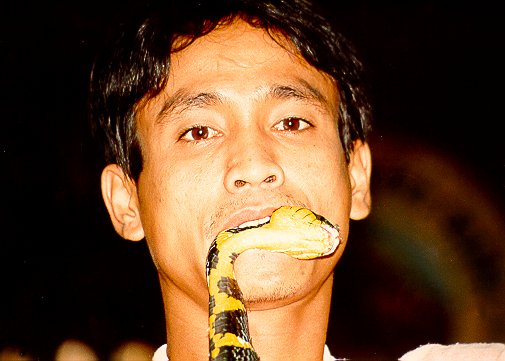 Don't try this at home kids Thonburi Snake Farm, Bangkok, Thailand. The snake is a Mangrove Viper - Extremely poisonous!